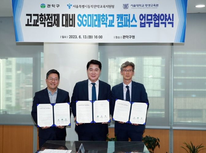 [제주교통복지신문 김강석 기자] 관악구가 지난 6월 13일 동작관악교육지원청(교육장 오정훈), 서울대학교 평생교육원(원장 이찬)과 고교학점제 대비 진로·진학 프로그램 SG미래학교 캠퍼스 운영을 위한 업무협약을 체결했다.