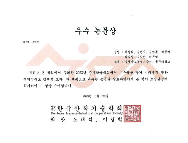 학회는 이 연구사의 논문이 비타베리 재배 농가의 영농 활동에 참고 자료로 활용되고 수출용 딸기 농업의 불확실성을 해소하는 데 도움이 될 것으로 평가하며 이번 상을 수여했다.