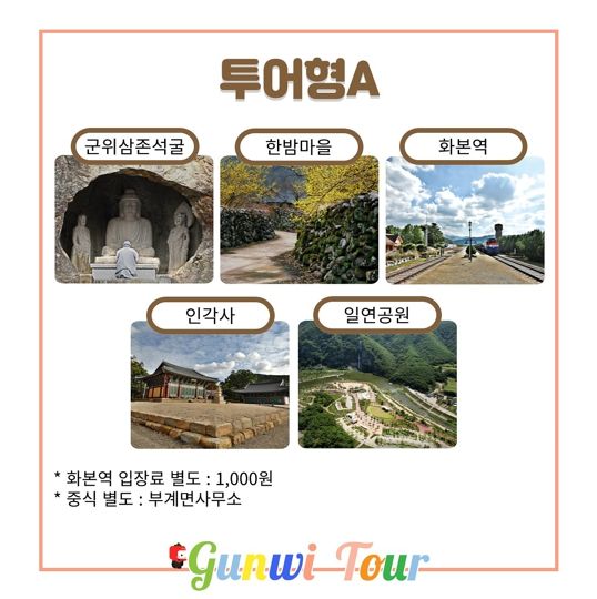 투어형 코스에서는 국보 군위삼존석굴, 일연스님이 삼국유사를 집필한 인각사를 포함하여 김수환추기경 사랑과나눔공원, 한밤마을, 화본역 등 현지 문화관광해설사들의 해설을 통해 한층 더 깊은 군위의 역사와 인물에 대한 다양한 이야기들을 만나볼 수 있다.
