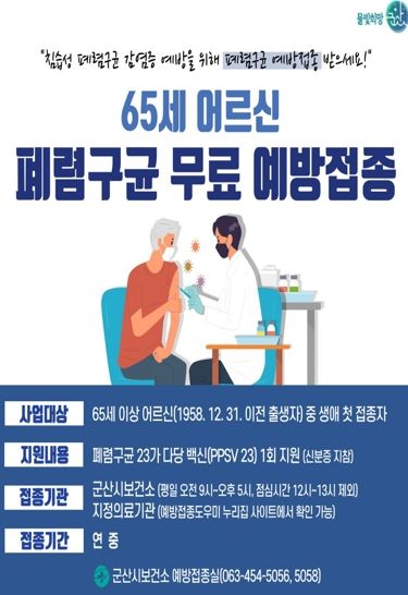 [제주교통복지신문 김강석 기자] 군산시 보건소가 침습성 폐렴구균 감염증(균혈증을 동반한 폐렴, 수막염 등) 예방을 위해 65세 이상 시민의 폐렴구균 예방접종을 당부했다.