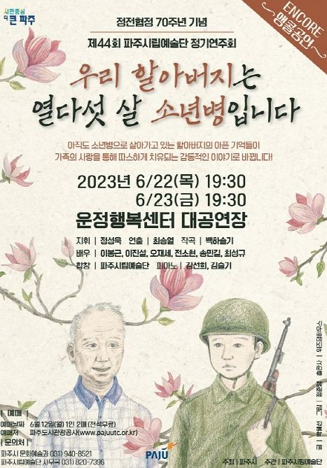 [제주교통복지신문 김강석 기자] 파주시는 6월 22일부터 23일까지 운정행정복지센터 대공연장에서 ‘우리 할아버지는 열다섯 살 소년병입니다’ 공연을 2회에 걸쳐 개최한다.