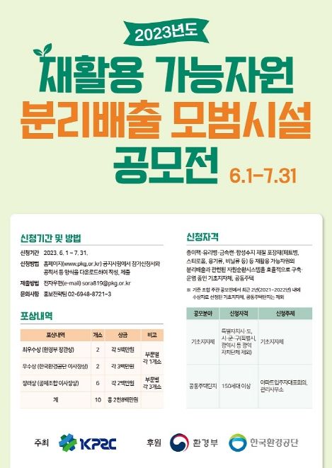 이번 공모전은 재활용 가능자원 분리배출의 회수·재활용체계를 구축하고 자원순환사회 촉진에 기여하기 위해 진행되며, 종이팩·투명 페트병 등 재활용 가능 자원의 분리배출 시스템을 효율적으로 구축한 공동주택을 대상으로 모집한다.