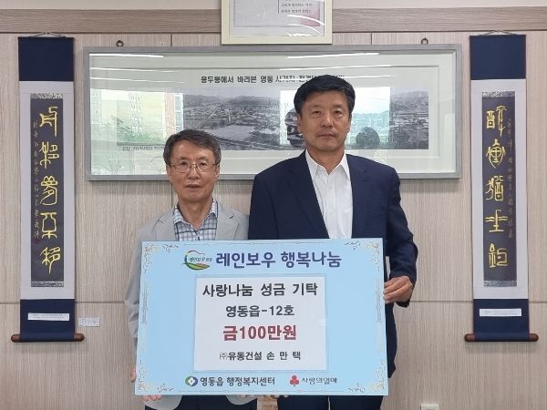 손만택 대표는 이날 영동읍에서 추진하는 나눔캠페인인 2023 사랑나눔 행복나눔 릴레이 제12호 기부천사가 되며 주기적인 나눔과 이웃사랑을 약속했다.