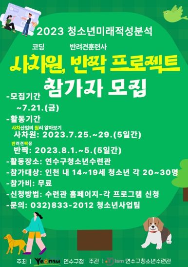 [제주교통복지신문 김강석 기자] 연수구청소년수련관은 오는 7월 21일까지 청소년 미래적성분석 프로그램인 ‘사차원’, ‘반짝’ 프로젝트의 참가자를 모집한다.