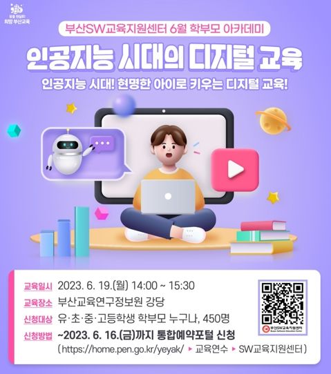 [제주교통복지신문 김강석 기자] 부산광역시교육청교육연구정보원은 오는 6월 19일 오후 2시 교육연구정보원 강당에서 관내 유ㆍ초ㆍ중ㆍ고 학부모 450명 대상으로 ‘인공지능 시대의 디지털 교육’을 주제로 6월 학부모 아카데미 교육 연수를 운영한다.