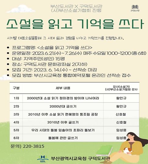 [제주교통복지신문 김강석 기자] 부산광역시립구덕도서관은 오는 6월 21일부터 7월 26일 매주 수요일 오전 10시부터 12시까지 성인 15명을 대상으로 ‘소설을 읽고 기억을 쓰다’ 프로그램을 운영한다.