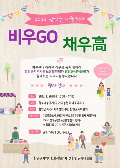 [제주교통복지신문 김강석 기자] 함안군은 나눔 문화 확산을 위해 오는 20일 행복나눔가게 내(구 가야농협 하나로마트)에서 ‘비우GO 채우高 나눔행사’를 개최한다고 밝혔다.