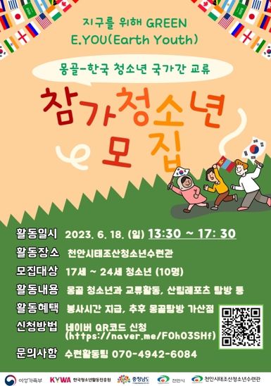 [제주교통복지신문 김강석 기자] 천안시와 천안시태조산청소년수련관은 오는 18일 진행하는 몽골-한국 청소년 국가 간 교류 활동에 참여할 청소년을 모집한다고 14일 밝혔다.