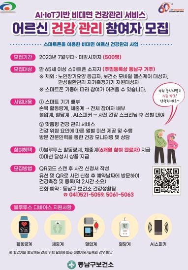 [제주교통복지신문 김강석 기자] 천안시 동남구보건소는 7월부터 시행할 인공지능(AI)과 사물인터넷(IoT)을 활용한 어르신 건강관리 서비스 사업 참여자 500명을 선착순으로 모집한다고 14일 밝혔다.
