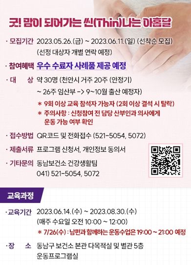 [제주교통복지신문 김강석 기자] 천안시 동남구보건소는 8월까지 임산부의 비만 예방 및 관리를 위해 ‘굿맘이 되어가는 씬(thin)나는 아홉달’ 프로그램을 운영한다고 14일 밝혔다.