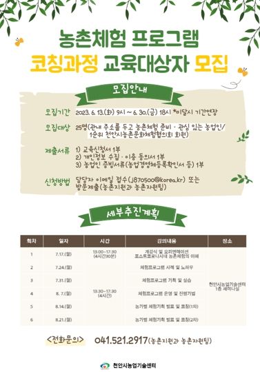 [제주교통복지신문 김강석 기자] 천안시농업기술센터가 오는 30일까지 ‘농촌체험 프로그램 코칭과정’ 교육대상자를 모집한다.