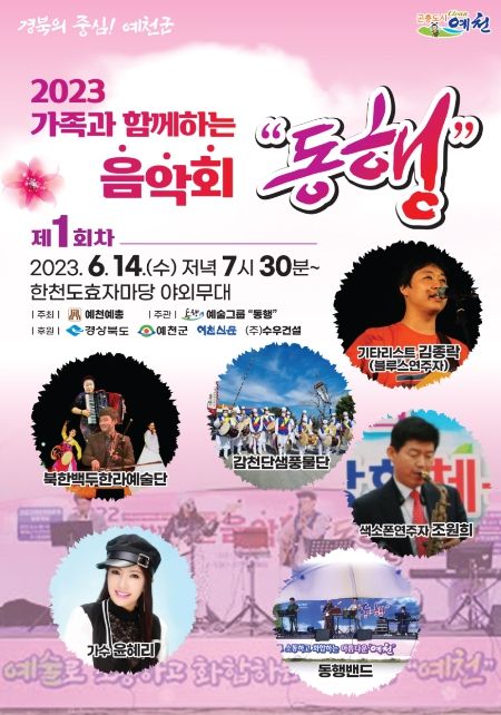 [제주교통복지신문 김강석 기자] 예천군은 이달 14일부터 8월 9일까지 매주 화요일, 수요일 오후 7시 30분 예천읍 한천 도효자마당과 호명면 걷고 싶은 거리에서 ‘2023 가족과 함께하는 음악회 동행’을 개최한다.