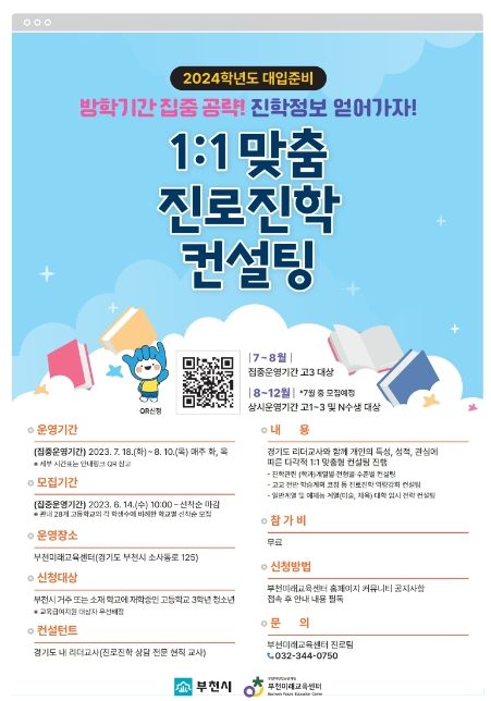 [제주교통복지신문 김강석 기자] 부천시는 부천미래교육센터에서 관내 고등학생 및 일반수험생을 대상으로 하는 ‘1:1 맞춤 진로진학 컨설팅 창구’를 오는 7월 18일(화)에 처음 오픈한다고 밝혔다.