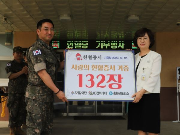 [제주교통복지신문 김강석 기자] 육군 3기갑여단 83전차대대는 세계 헌혈자의 날(6월 14일)을 맞이하여 홍천군보건소에 헌혈증 132매를 기부하는 행사를 진행했다.