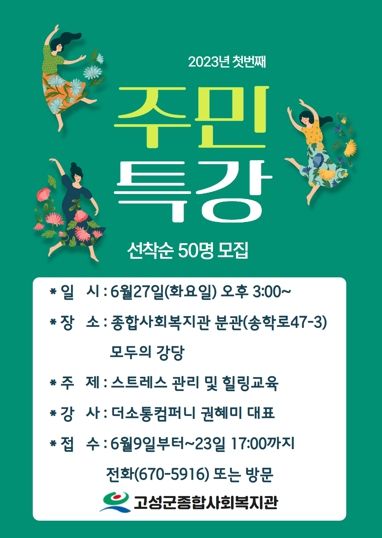 특강은 6월 27일 오후 3시 고성군종합사회복지관 분관(송학로 47-3) 모두의 강당에서 열리며, 선착순으로 50명 모집한다.
