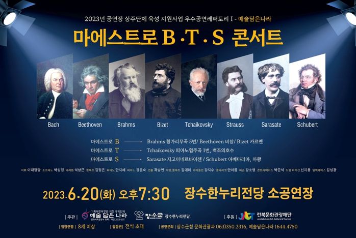 [제주교통복지신문 김강석 기자] 장수군이 전라북도 문화관광재단 공모사업으로 추진하는 ‘Maestro BTS’ 공연을 오는 20일 오후 7시 30분에 장수한누리전당 소공연장에서 개최한다.