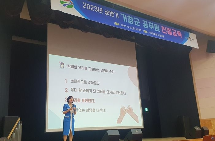 [제주교통복지신문 김강석 기자] 거창군은 거창문화원 상살미홀에서 거창군 공무원 200명을 대상으로 ‘2023 공생공존 민원인과의 친절한 마음의 거리’를 주제로 공직자 친절 교육을 시행했다고 14일 밝혔다.