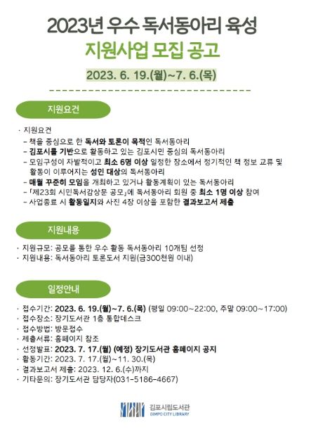 [제주교통복지신문 김강석 기자] 김포시립도서관은 지역사회 안에서의 독서커뮤니티 활성화와 시민들의 자발적인 독서 생활화를 위해 ‘우수 독서동아리 육성 지원사업’을 실시한다.