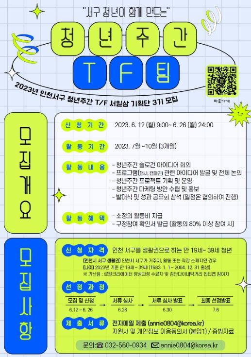 [제주교통복지신문 김강석 기자] 인천시 서구가 오는 9월 법정기념일인 청년의 날을 기념하는 ‘청년주간’을 기획하고 운영할 기획단을 모집한다고 14일 밝혔다.
