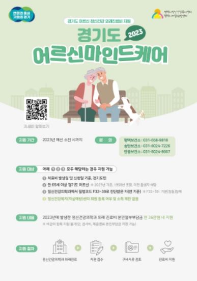 노인 정신 건강 외래치료비 지원 사업인 ‘경기도 어르신 마인드 케어’는 우울증으로 정신 건강이 취약한 노인을 위해 정신과 외래치료비를 지원함으로써 경제적 부담을 완화하여 적극적인 치료 및 관리를 도모하는 사업이다.