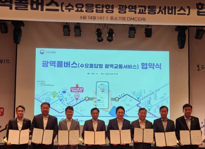 수원시를 비롯해 공모사업 대상지로 선정된 6개 지자체와 국토교통부, 경기도는 14일 서울 상암 DMC타워 DMC홀에서 협약을 체결하고, 광역콜버스 시범사업에 적극적으로 협력하기로 했다.