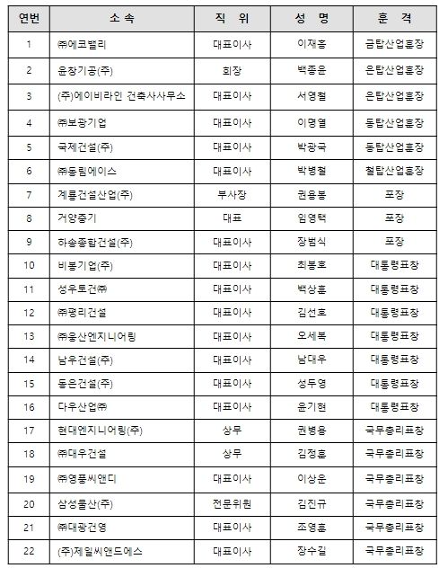 한편, 건설산업 발전에 공로에 큰 이재흥 ㈜ 에코벨리 대표이사 등 유공자 109명에게는 금탑산업훈장 등 훈장(6)과, 산업포장(3), 대통령 표창(7), 국무총리 표창(6), 국토교통부장관 표창(87)이 각각 수여될 예정이다.