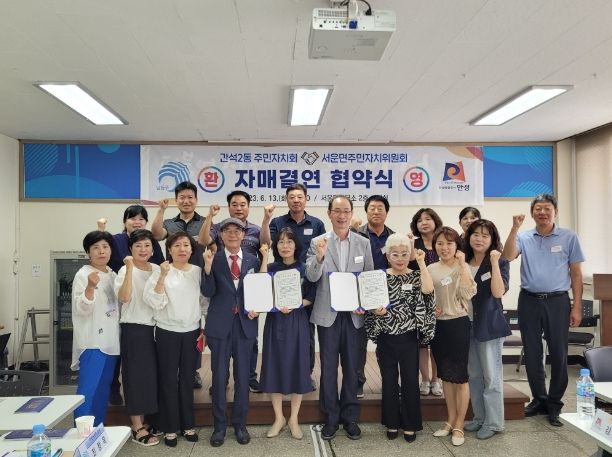 [제주교통복지신문 김강석 기자] 안성시는 13일 서운면사무소 2층 회의실에서 인천광역시 남동구 간석2동 주민자치회와 서운면 주민자치위원회 간의 자매결연 협약을 체결했다고 밝혔다.