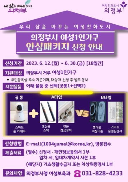 [제주교통복지신문 김강석 기자] 의정부시는 여성 1인가구의 범죄 예방 및 안전한 생활환경 조성을 위해 ‘여성 1인가구 안심패키지 지원 대상자’를 6월 30일까지 모집한다.