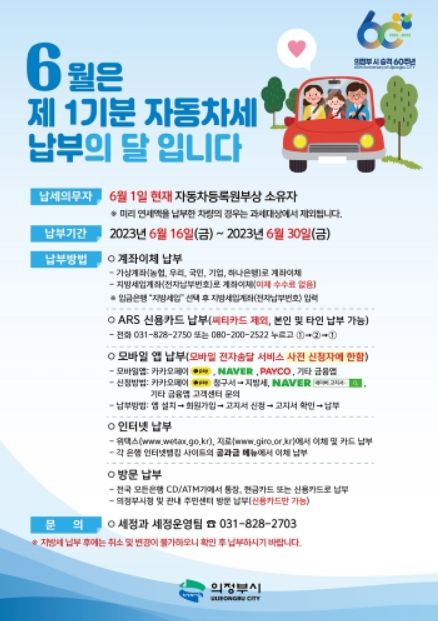 [제주교통복지신문 김강석 기자] 의정부시는 2023년 6월 제1기분 자동차세 11만4천355건, 117억 원을 부과하고 고지서를 납세자에게 일제히 송부한다고 14일 밝혔다.