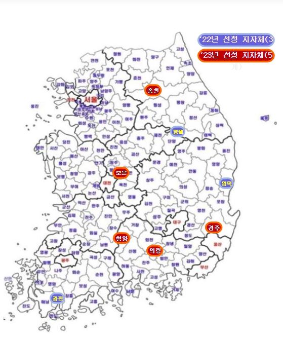 선정된 지자체는 강원도 홍천군, 충청북도 보은군, 경상북도 경주시, 경상남도 의령군, 경상남도 함양군 등 5곳이며, 서면심사와 현지실사 등을 거쳐 선정됐다.