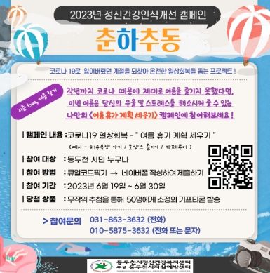 [제주교통복지신문 김강석 기자] 동두천시정신건강복지센터는 코로나19 후유증 예방을 주제로 온라인 정신건강인식개선 캠페인 “춘하추동”을 오는 19일부터 30일까지 진행한다.