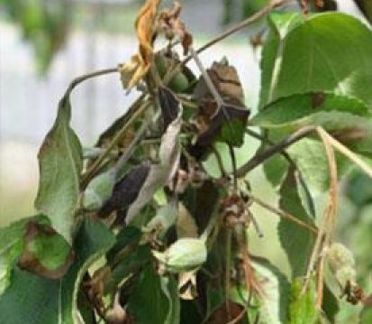 화상병에 감염되면 잎자루부터 흑갈색의 병 무늬가 나타나고, 잎맥을 따라 진전된다. 또한 가지는 갈변되고 끝이 갈고리 모양으로 말리며 세균 액이 누출되는 모습을 나타내며, 심할 경우 나무가 고사한다.