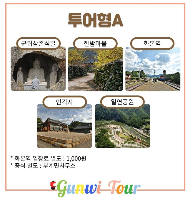 투어형 코스에서는 국보 군위삼존석굴, 일연스님이 삼국유사를 집필한 인각사를 포함하여 김수환추기경 사랑과나눔공원, 한밤마을, 화본역 등 현지 문화관광해설사들의 해설을 통해 한층 더 깊은 군위의 역사와 인물에 대한 다양한 이야기들을 만나볼 수 있다.