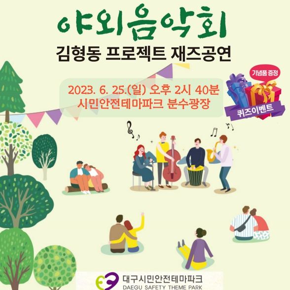 대구문화예술진흥원과 협업한 이번 야외 음악회는 재즈의 숨은 매력을 알리고, 시민안전테마파크를 방문한 시민들을 위해 공연 시작 전 퀴즈 이벤트를 진행하여 기념품도 선물할 계획이다.