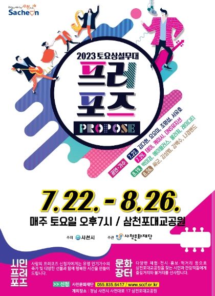[제주교통복지신문 김강석 기자] 사천의 대표적인 여름축제인 ‘2023 토요상설무대 프러포즈’가 삼천포대교공원 해상무대에서 화려하게 펼쳐진다.