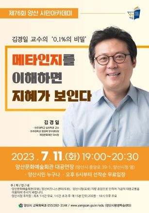 『제76회 양산시민아카데미』는 아주대학교 심리학과 김경일 교수를 초청해 ‘0.1%의 비밀’메타인지를 이해하면 지혜가 보인다란 주제로 진행되며, 최근 떠오르는 ‘메타인지’를 통해 지혜에 관한 심리학적 접근에 한 걸음 더 다가가 쉽게 배울 수 있는 의미 있는 자리가 될 것으로 기대된다.