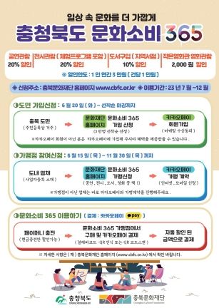 [제주교통복지신문 김강석 기자] 충청북도와 (재)충북문화재단은 6월 15일부터 가맹점(업체) 참여, 6월 20일부터 충북도민 이용 신청을 시작으로 2023년도 ‘문화소비 365’사업을 본격적으로 개시한다.