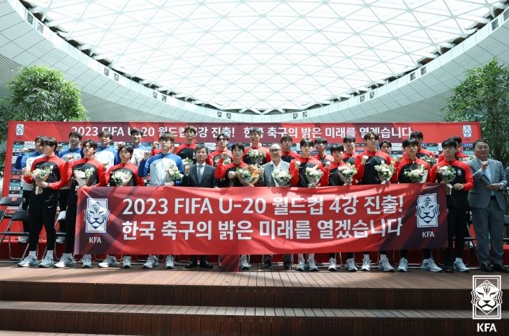 2023 FIFA U-20 월드컵 4강 신화를 이룩한 U-20 대표팀의 입국 환영 행사가 14일 오후 인천국제공항에서 진행됐다. 정몽규 회장, 장외룡 부회장 등 대한축구협회 임원들이 직접 참석해 선수들을 격려했으며, 이른 시간부터 몰린 팬들로 인천공항 입국장은 문전성시를 이뤘다.