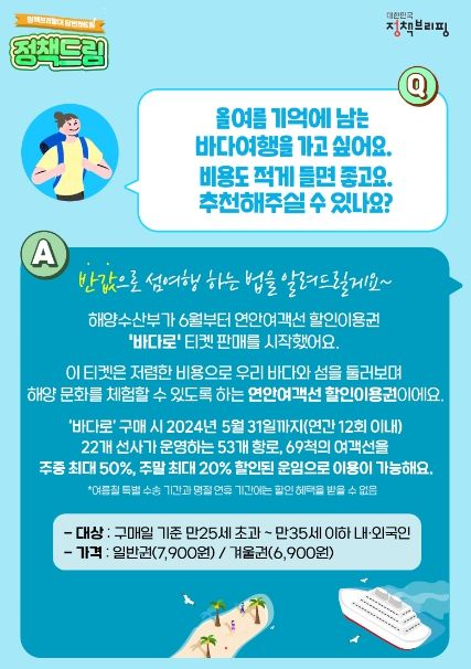 A. 해양수산부가 6월부터 연안여객선 할인이용권 '바다로' 티켓 판매를 시작했어요. 이 티켓은 저렴한 비용으로 우리 바다와 섬을 둘러보며 해양 문화를 체험할 수 있도록 하는 연안여객선 할인이용권이에요.