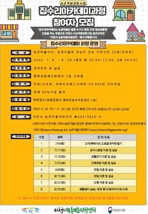 교육비와 재료비 등 무료과정으로 총 8회 48시간 중 대부분을 실습 위주로 진행되는 이번 집수리아카데미 과정에 참여하실 분은 이천시 홈페이지 또는 이천시 농촌마을지원센터 홈페이지 공지사항을 참고하여 6월 23일까지 근무시간 내 방문접수하면 된다.