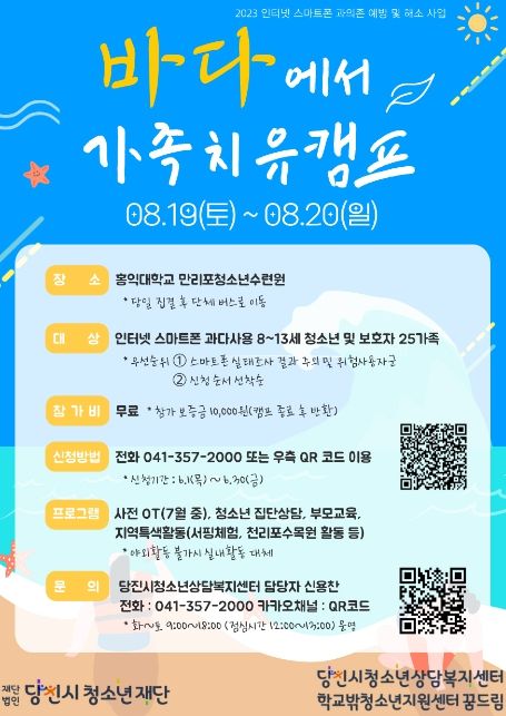 [제주교통복지신문 김강석 기자] 충청남도 당진시청소년재단 산하기관 당진시청소년상담복지센터는 ‘핸드폰 밖은 바다’라는 주제로 인터넷·스마트폰 과의존 예방 및 해소 1박 2일 가족치유캠프를 8월 19일(토)~20일(일) 양일간 만리포수련원(충남 태안군)에서 진행한다.