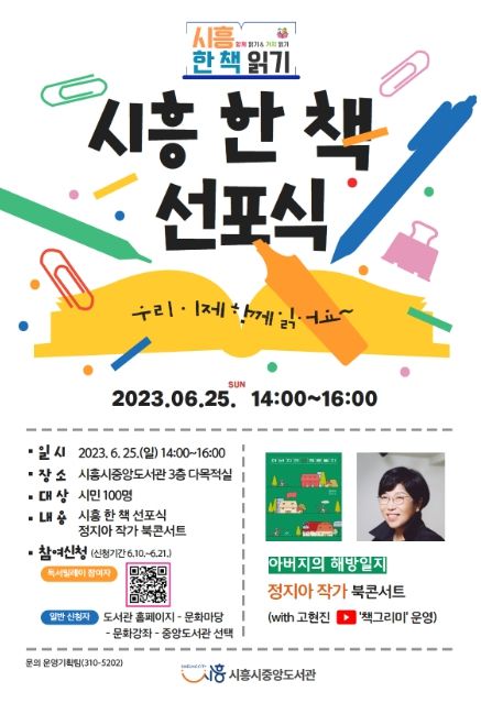 이번 선포식을 통해 올해의 ‘시흥 한 책’을 시민에게 알리고 홍보한다. 행사는 ‘2023 시흥 한 책’ 선포, 4인 이상으로 구성된 독서 릴레이 100팀에 도서 전달, ‘아버지의 해방일지’ 정지아 작가의 북 콘서트 등으로 구성했다.