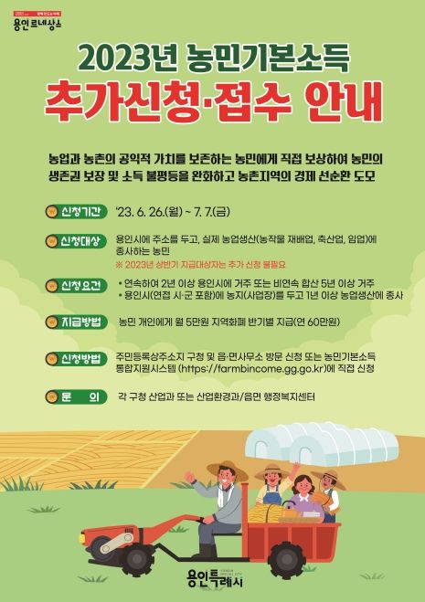 [제주교통복지신문 김강석 기자] 용인특례시는 상반기에 농민기본소득을 신청하지 못한 농민을 위해 오는 26일부터 다음 달 7일까지 추가 신청을 받는다고 15일 밝혔다.