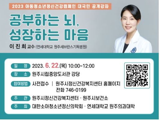 [제주교통복지신문 김강석 기자] 원주시정신건강복지센터는 오는 22일 시립중앙도서관 강당에서 아동·청소년 정신건강 공개강좌 '공부하는 뇌, 성장하는 마음'을 개최한다.