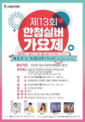 [제주교통복지신문 김강석 기자] 강릉단오제 맞이 ‘제13회 한청실버가요제’가 오는 18일 오후 1시 단오장 내 수리마당에서 개최된다.
