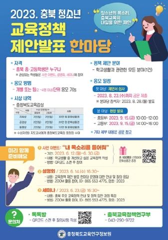 [제주교통복지신문 김강석 기자] 충청북도교육청 직속기관 교육연구정보원(원장 백우정)은 ‘2023. 충북 청소년 교육정책 제안 발표 한마당’을 오는 6월부터 9월까지 진행한다.