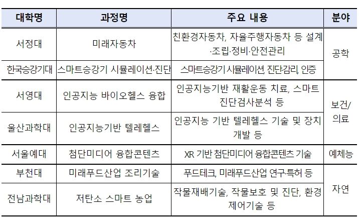 공학분야에서는 미래자동차(서정대), 스마트승강기 시뮬레이션·진단(한국승강기대) 2개 과정이, 보건·의료분야에서는 인공지능기반 텔레헬스(울산과학대), 인공지능 바이오헬스 융합(서영대) 2개 과정이 인가된다. 예체능분야에서는 첨단미디어 융합콘텐츠(서울예대) 1개 과정이, 자연분야에서는 미래푸드산업 조리기술(부천대) 및 저탄소 스마트 농업(전남과학대) 2개 과정이 인가된다.