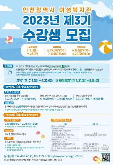 [제주교통복지신문 김강석 기자] 인천광역시는 오는 22일부터 여성복지관 2023년도 제3기 사회교육강좌 수강생을 모집한다고 밝혔다.