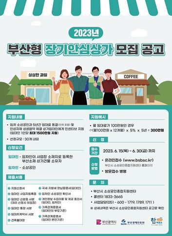 [제주교통복지신문 김강석 기자] 부산시와 (재)부산경제진흥원은 임차 소상공인의 임대료 부담경감 및 장기간 안정적 영업환경 조성을 위한 '2023년 부산형 장기안심상가 지원사업'의 대상자를 오늘(15일)부터 6월 30일까지 공개모집 한다고 밝혔다.