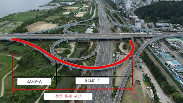 통제 기간은 내일(16일) 오후 10시부터 6월 23일 오후 4시까지 일주일간 진행되며, 램프 상부도로 콘크리트 포장 등 원활한 공사 진행을 위해 부득이 차량 통행을 전면 통제한다.